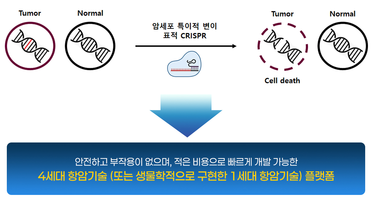 우리 회사는 CRISPR 기술을 활용하여, 암세포에만 존재하는 InDel 변이 부위를 정확히 인식하고 절단함으로써 암세포를 선택적으로 사멸시키는 치료법을 개발 중입니다.